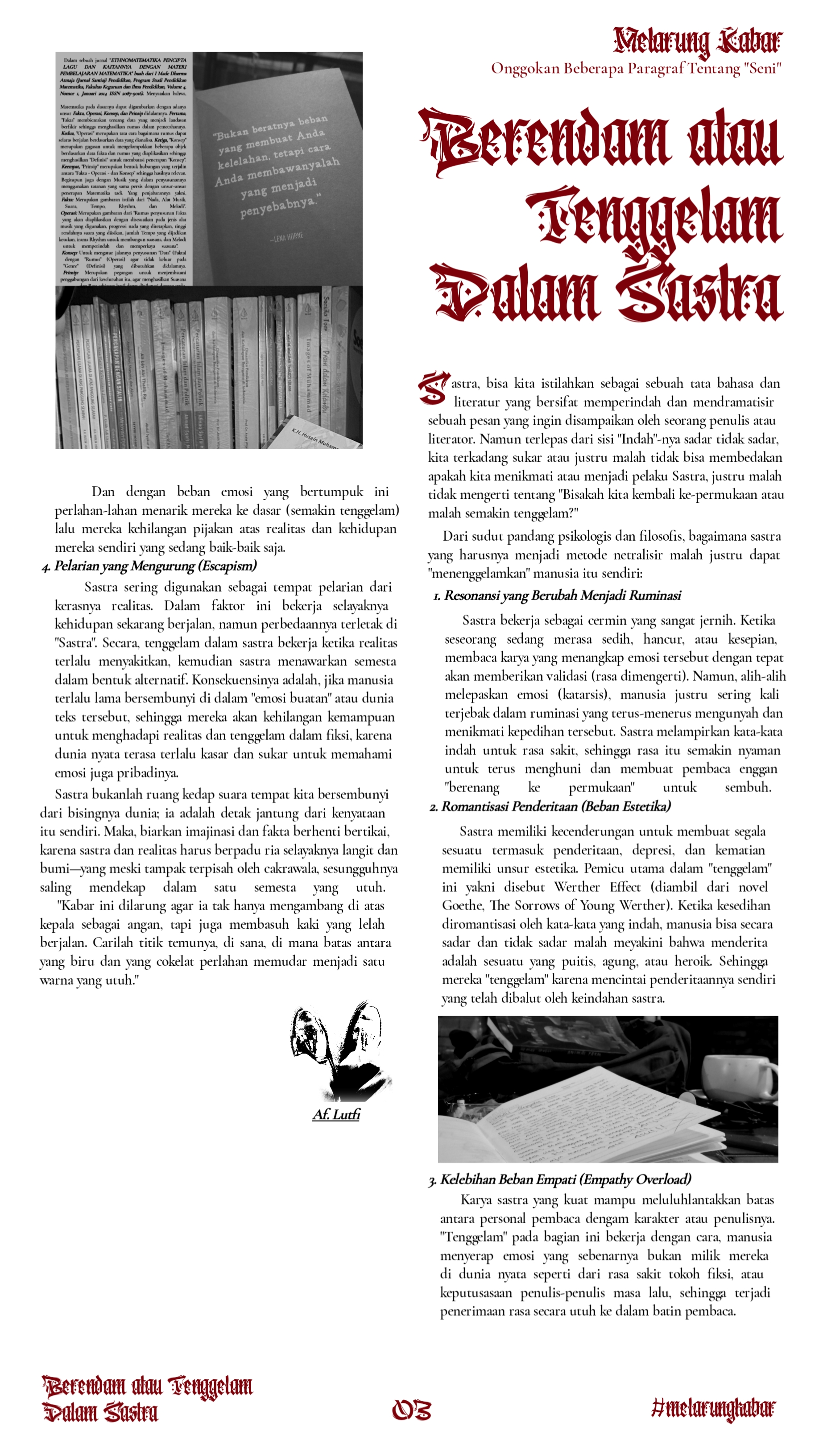 Menerjemahkan Sastra sebagai salah satu bentuk metode dalam mengatasi permasalah mental health, justru malah sering disalah gunakan sebagai dramatisasi kesedihan yang justru membuat semakin tersesat.
